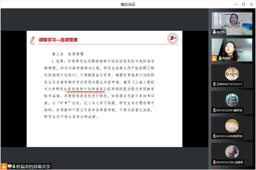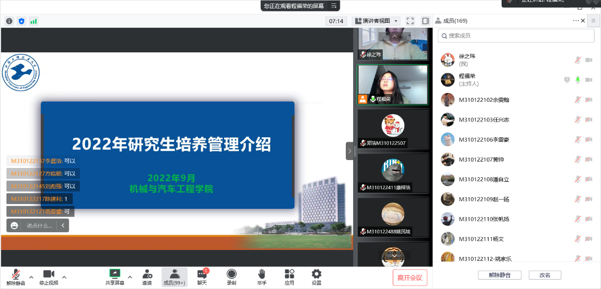 新生入学教育是是高校落实立德树人根本任务的重要环节。根据学校工作要求,切实做好2022级研究生新生入学教育,进一步落地落实落细研究生培养管理相关规章制度,增强研究生自我教育、自我管理和自我服务的能力,PP电子游戏网站于2022年10月9日线上组织开展了2022级研究生培养管理制度学习专题会议。学院研究生秘书程福荣、徐之玮主持了会议,2022级全体研究生参加了此次会议。