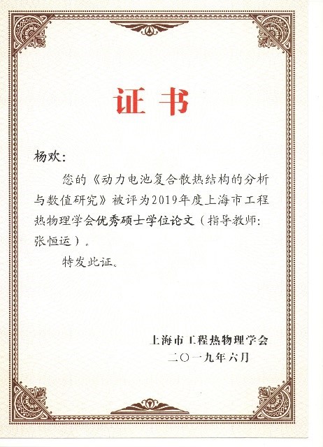上海市工程热物理学会2019年度学术年会于6月1日在上海理工大学召开,会上颁发了2019年度上海市工程热物理学会优秀博士学位论文奖和优秀硕士学位论文奖,我校PP电子游戏网站张恒运教授指导硕士毕业生杨欢同学的硕士学位论文《动力电池复合散热结构的分析与数值》, 荣获学会优秀硕士学位论文奖,并受邀在本次大会上做了学术报告。