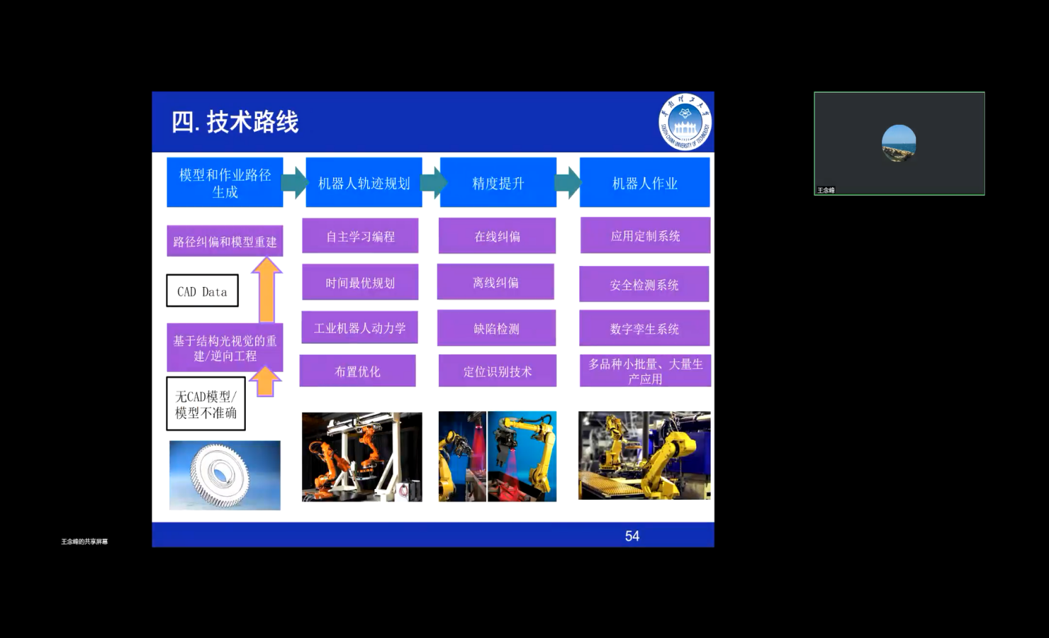 王念峰教授以“融合视觉智能的高性能工业机器人软件平台关键技术研究”为题做了精彩的学术报告,他从自身经历为角度切入,阐述了工业机器人的研究前沿和发展趋势。王教授首先介绍了我国工业制造现状以及智能制造领域中机器人占据的重要地位。随后,他指出了当前工业机器人技术诸如编成效率低,智能化程度低,控制器跟踪能力差等缺陷,针对这些缺陷引出了当前实验室所研究的关键科学问题,阐述了相关技术路线,并详细介绍了自己实验室所做的工作和研究目标。最后,王念峰教授指出了工业机器人当前的关键技术问题,为研究生同学们日后的研究方向提供了宝贵参考。