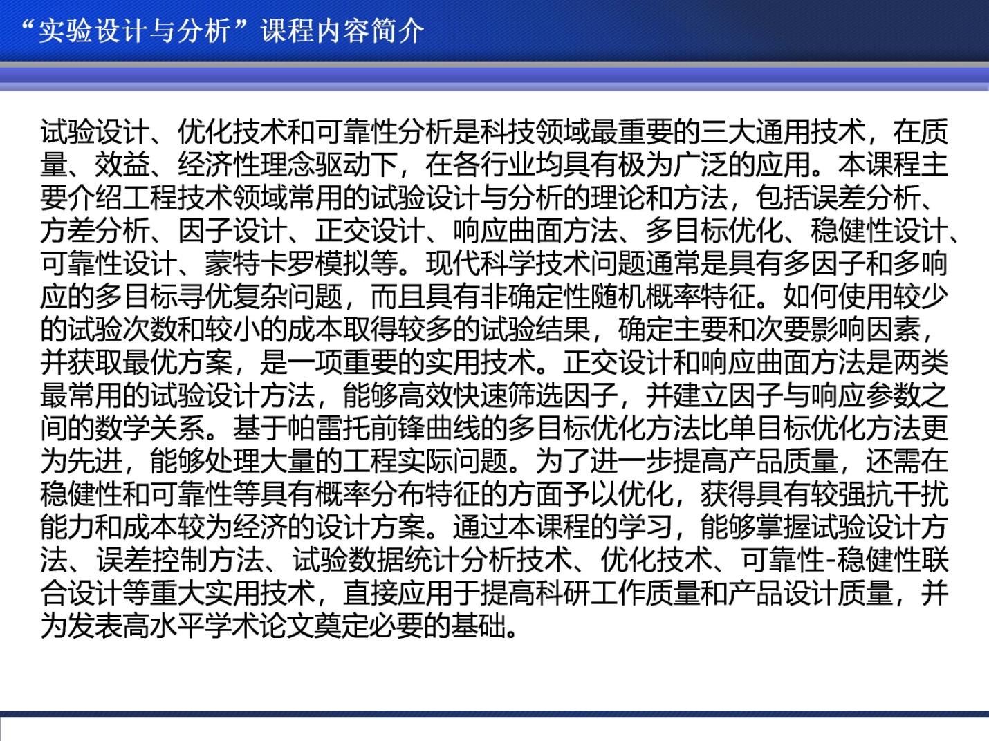 通过本系列讲座,同学们开阔了视野,全方位把握了学科发展的脉搏,并通过分组课程作业的方式积极参与了三个方向的大量工程案例分析(正交设计、响应曲面方法、稳健性设计),做到了理论联系实际。本年度关于试验设计及优化技术的系列讲座的成功举办,将继续巩固我院在该领域的先进教学成果和教学特色,并能鼓励研究生和教师们将先进的试验设计及优化方法积极运用到科研工作中,持续提高我院师生的教学和科研工作水平。