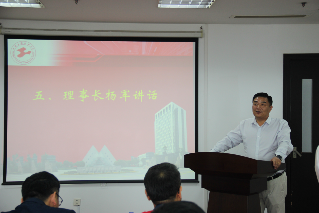 接下来,理事长杨军代表全体理事会成员发言,他表示:我们在母校获得了立身的真知,掌握了搏击的本领,放飞了收获的希望,不论走到哪里,身在何方,官居何职,都将感激恩师的教诲与期望,牵挂母校的建设与发展,希望母校越办越好。