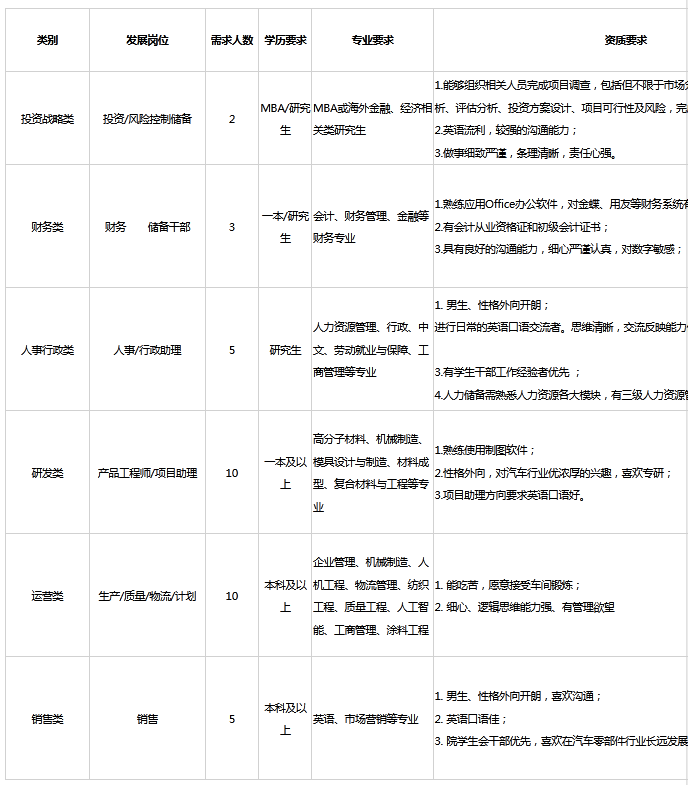 职业生涯规划:公司非常重视员工职业发展,对于稳定性强、能吃苦,肯专研的毕业生,三年-五年可培养成中层干部或骨干,五年-十年可以培养成高层管理。