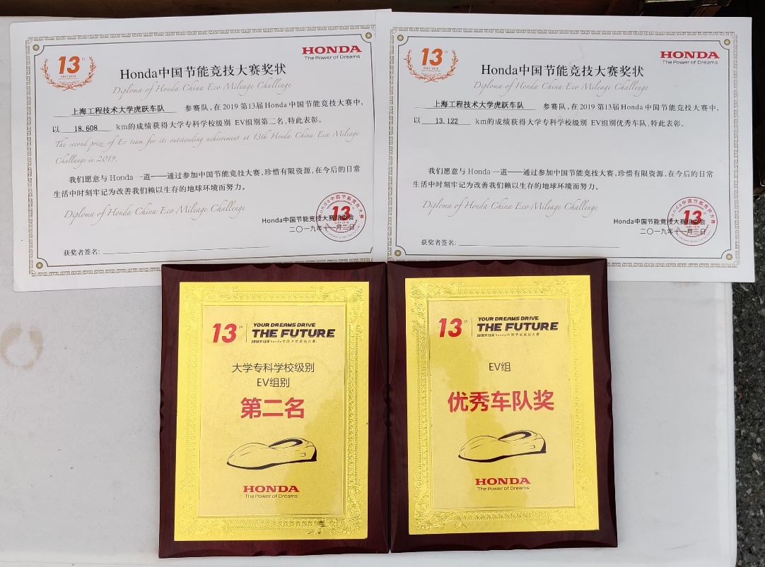 2019年10月31日至11月3日,在广东肇庆国际赛车场举办2019Honda中国节能竞技大赛,期间共有来自全国的高校和企业的66支电车(EV)代表队和70支燃油(EP)代表队。经过激烈角逐,我校PP电子游戏网站虎跃车队获得佳绩,以18608km成绩获得EV组别第二名,并荣获优秀车队奖。