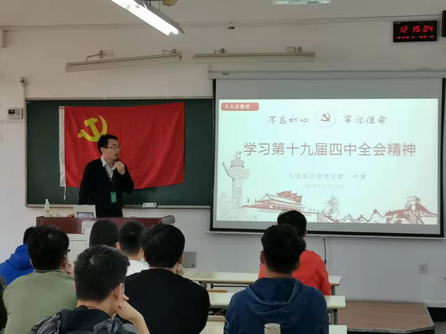支部党员叶寅老师的党课以“学习十九届四中全会精神”为主题。叶老师介绍和讲解了党的十九届四中全会的总述和意义基本情况,十九届四中全会的主要内容,传达会议的精神。叶老师说大家要深刻把握党的十九届四中全会的重大意义和核心要义。在工作和生活中,希望支部成员牢记党的使命,为祖国伟大工程、伟大事业、伟大梦想不懈奋斗。