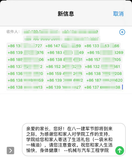 本次拥军优属活动为服役学生家庭送上了大米等生活必需品,代表着全院师生的一份心意,为军属带去一份安心和温馨。此外,学院通过短信向军属致以诚挚的问候,简短的文字承载着学院师生的拥军情,表达了对军人家庭幸福平安的美好祝愿。
