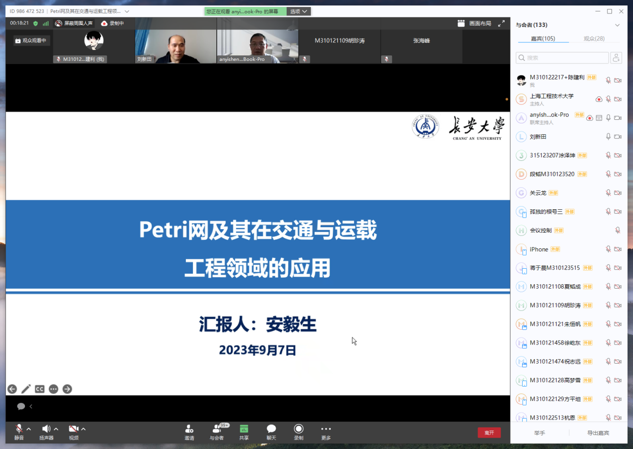 2023年9月7日14:00,通过华为云会议视频平台,长安大学博士生导师,信息工程学院院长安毅生教授为暑期学员做题为《Petri网及其在交通与运载工程领域的应用》的线上专题讲座。讲座由PP电子游戏网站副院长刘新田教授主持。