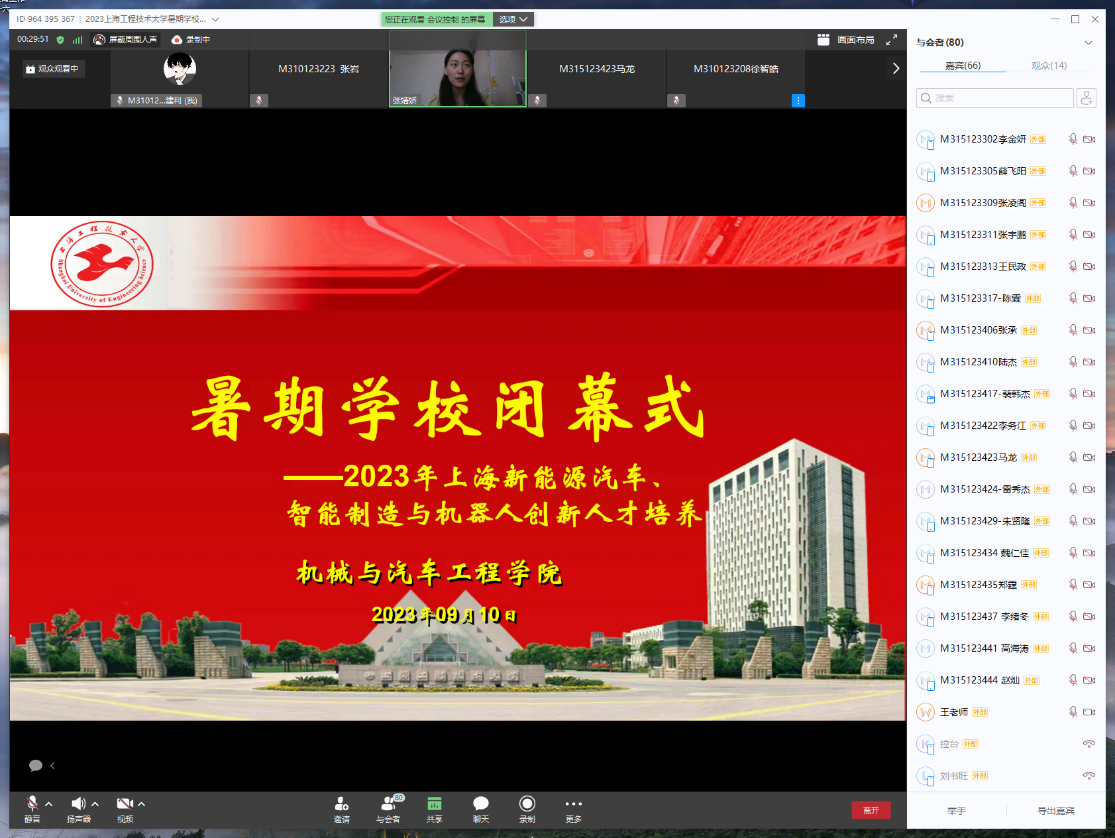 2023910日下午,由上海市学位委员会主办,PP电子游戏网站承办的2023年上海“新能源汽车、智能制造及机器人创新人才培养”研究生云端暑期学校风云榜评比活动暨结业典礼在华为云会议平台直播上如期举行。PP电子游戏网站副院长刘新田教授、暑期学校全体学员、志愿者共200余人参加了结业典礼。结业典礼由PP电子游戏网站张婧娇老师主持。