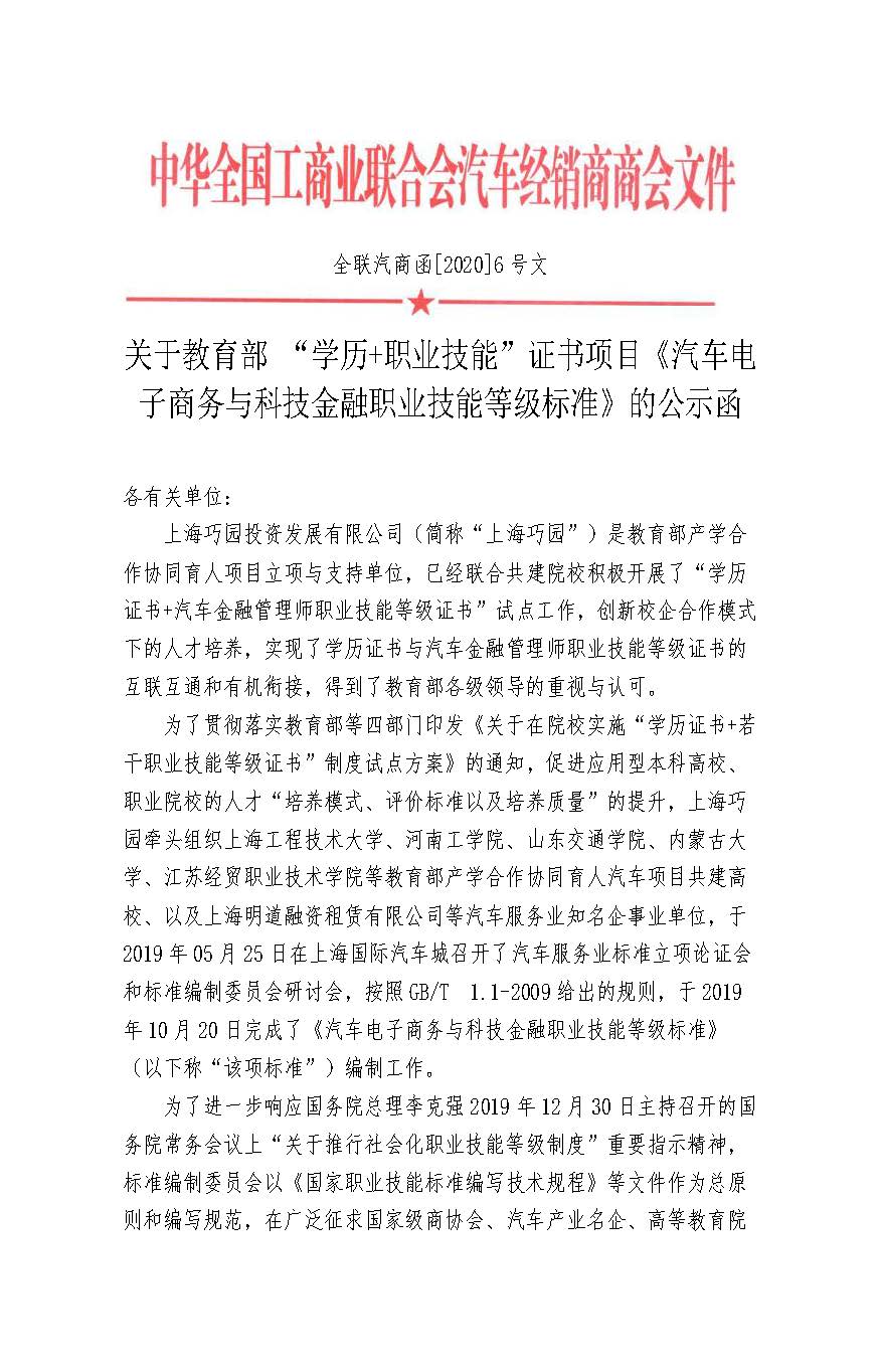 为了贯彻落实教育部等四部门印发《关于在院校实施“学历证书+若干职业技能等级证书”制度试点方案》的通知,促进应用型本科高校、职业院校的人才“培养模式、评价标准以及培养质量”的提升,中华全国工商业联合会汽车经销商商会、巧园汽车平台牵头,联合PP电子游戏网站、河南工学院、山东交通学院、内蒙古大学、江苏经贸职业技术学院等高等院校,以及上海明道融资租赁有限公司等汽车服务业知名企事业单位,按照GB/T 1.1-2009给出的规则,共同完成了《汽车电子商务与科技金融职业技能等级标准》(以下称“该项标准”)编制工作。