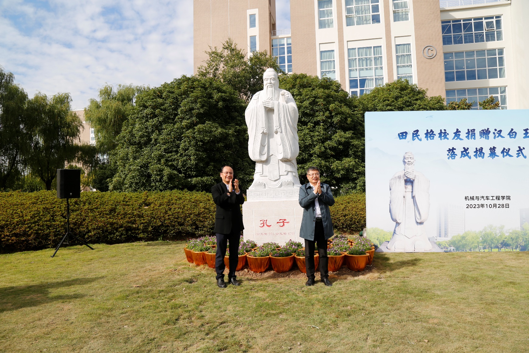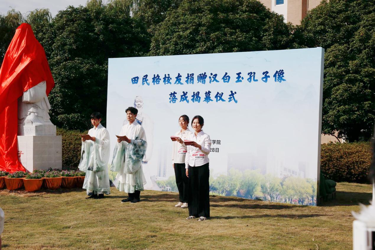 仪式上,俞涛校长和田民格校友共同为孔子像揭幕,并与现场师生合影留念。