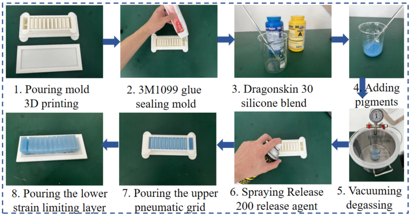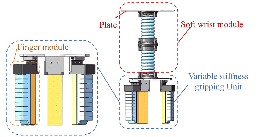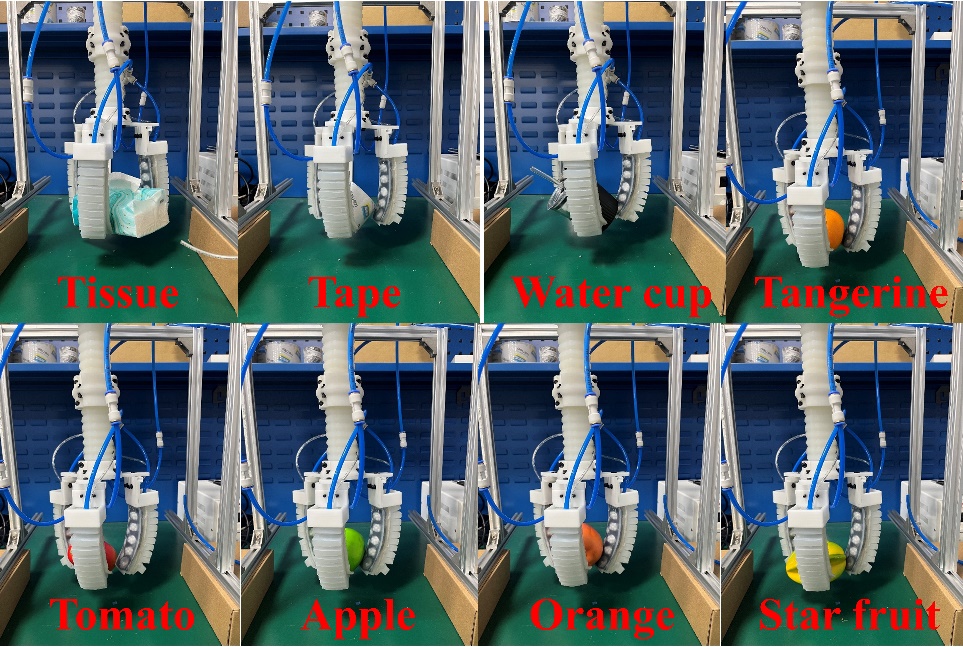 相比刚性抓手,软体抓手更加灵活、安全、适应性强,在医疗、服务、食品等领域具有广阔的应用前景。该论文提出了一种新型颗粒阻塞变刚度结构,通过蜂巢状网格支撑结构将阻塞颗粒分割成若干个区域,有效地减少了手指弯曲过程中颗粒重组造成的形状不稳定。该抓手不仅能够实现抓手柔性接触、刚性抓取,而且采用两段类似手臂功能的柔性腕,实现了在空间内多向抓取能力。实验表明,该抓手能够抓取形状和质量各异的目标物体,在阻塞气压为-50KPa的条件下,阻塞状态下的刚度能达到自然状态下刚度的9.8倍;在驱动气压30KPa和阻塞气压-30KPa的条件下,抓手的抓取质量可达315g,表明了该抓手能够实现较好的变刚度的能力并满足对日常果蔬、食品的抓取需求。