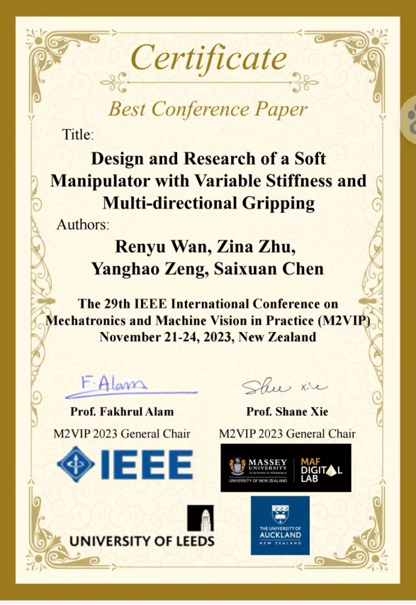 PP电子游戏网站智能协作机器人科研团队的论文“Design and Research of a Manipulator with Variable Stiffness and Multi-directional Gripping”荣获最佳论文奖,第一作者为硕士研究生万仁宇,指导老师有朱姿娜、陈赛旋等。
