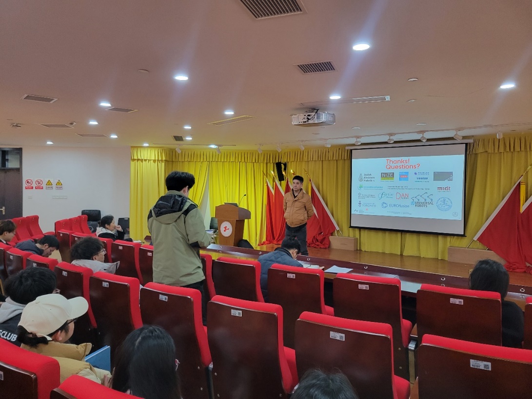 张教授在报告中详细介绍了其所在课题组进行的最新研究成果。报告涵盖了多个领域,包括机器人系统的设计建模和控制、机器人操纵控制理论、康复机器人和工业机器人的制造与生产。特别是在协作机器人领域,张教授探讨了中小企业生产和制造中的挑战,并提出了一些解决方案。他指出,协作机器人在提高生产效率、降低成本和改善工作环境方面具有巨大潜力。张教授表示,通过深入研究和合作,中丹两国可以共同推动协作机器人技术的发展,为双方企业提供更多的合作机会。报告中另一个重要议题是中丹双边研究网络计划。张教授介绍了该计划旨在促进中丹两国科研机构之间的合作,特别是在机器人领域。他强调了这一倡议为两国研究人员提供了一个独特的合作平台,有望推动机器人技术的创新和发展。 随后,张教授耐心解答了同学们提出的问题,并与大家展开了深入的交流和讨论。整个报告会深深吸引了在场师生的兴趣,拓宽了大家的学术视野。张教授与现场师生进行了深入而富有成效的讨论。与会者纷纷表示,张教授团队的研究成果为未来机器人技术的发展描绘了崭新的蓝图,期盼未来能有更多的交流与深入合作。