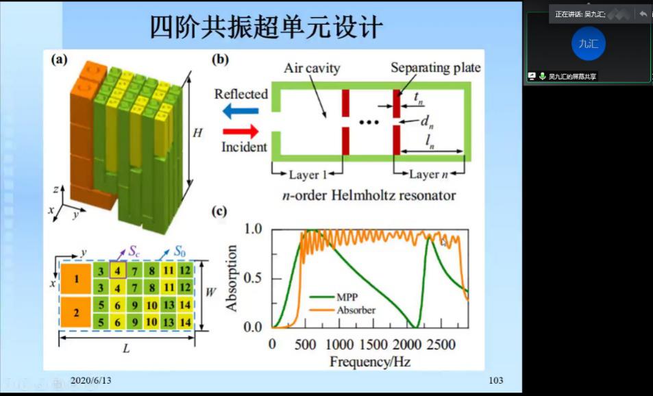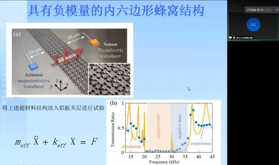 2020年6月13日上午,应PP电子游戏网站和上海市新能源汽车振动噪声测试与控制专业技术服务平台邀请,西安交通大学教授、博士生导师吴九汇教授做了题为《声学超材料的小尺寸大宽带吸声机理及应用》的视频学术报告,并就研究生提出的学术问题,进行了细致解答和交流。学院副院长、平台副主任郭辉老师代表学院和平台,对吴九汇教授的到来表示了热烈欢迎。
