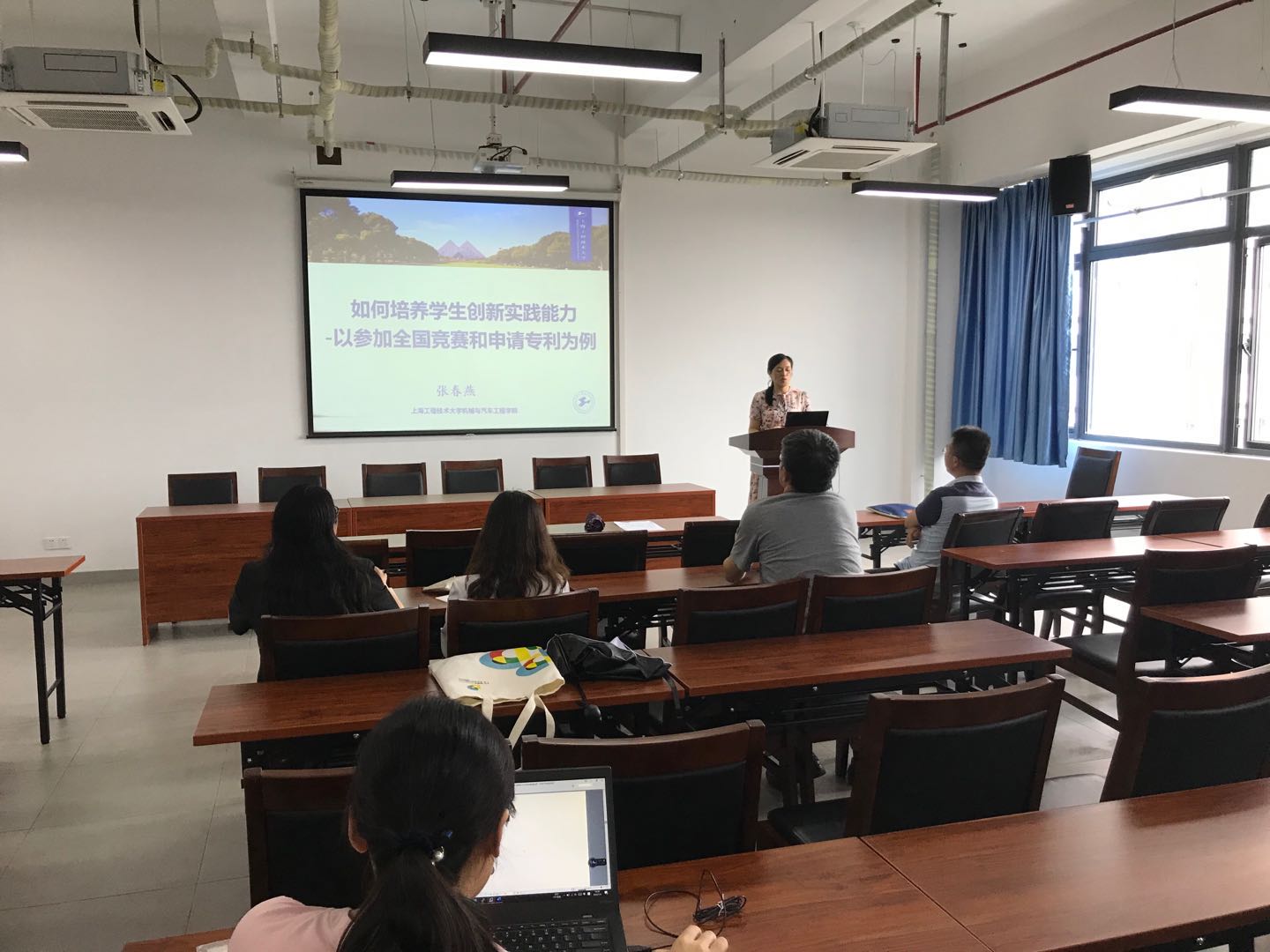 张春燕老师则以如何培养学生的创新实践能力为主题,详细剖析了研究生培养和本科生在创新能力培养方面的主要区别,并以自身求学经历,说明工程应用的实用性背景在专利申请方面的重要作用,并和在场老师交流了学生管理和引导学生参加全国竞赛的一些实战经验。