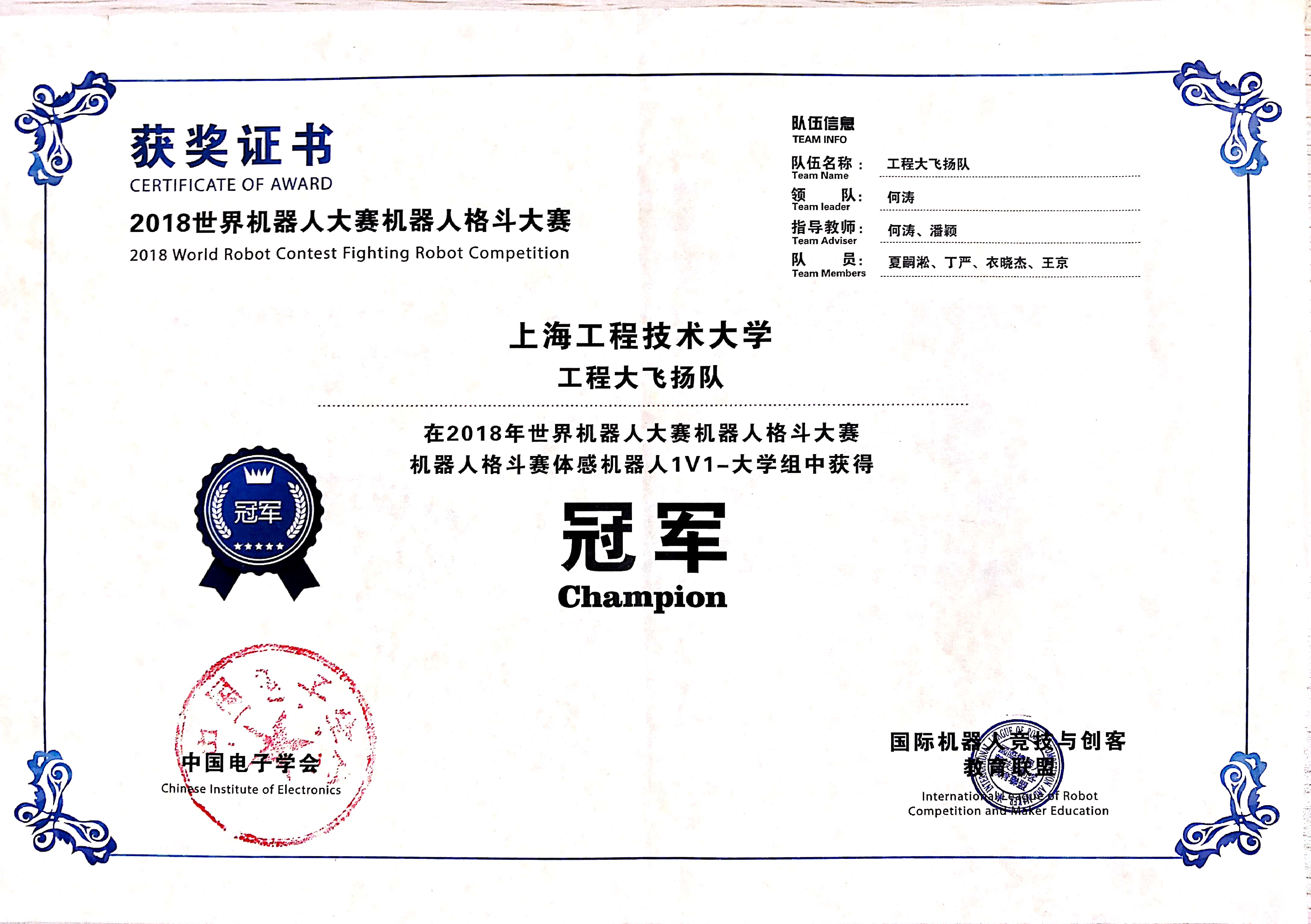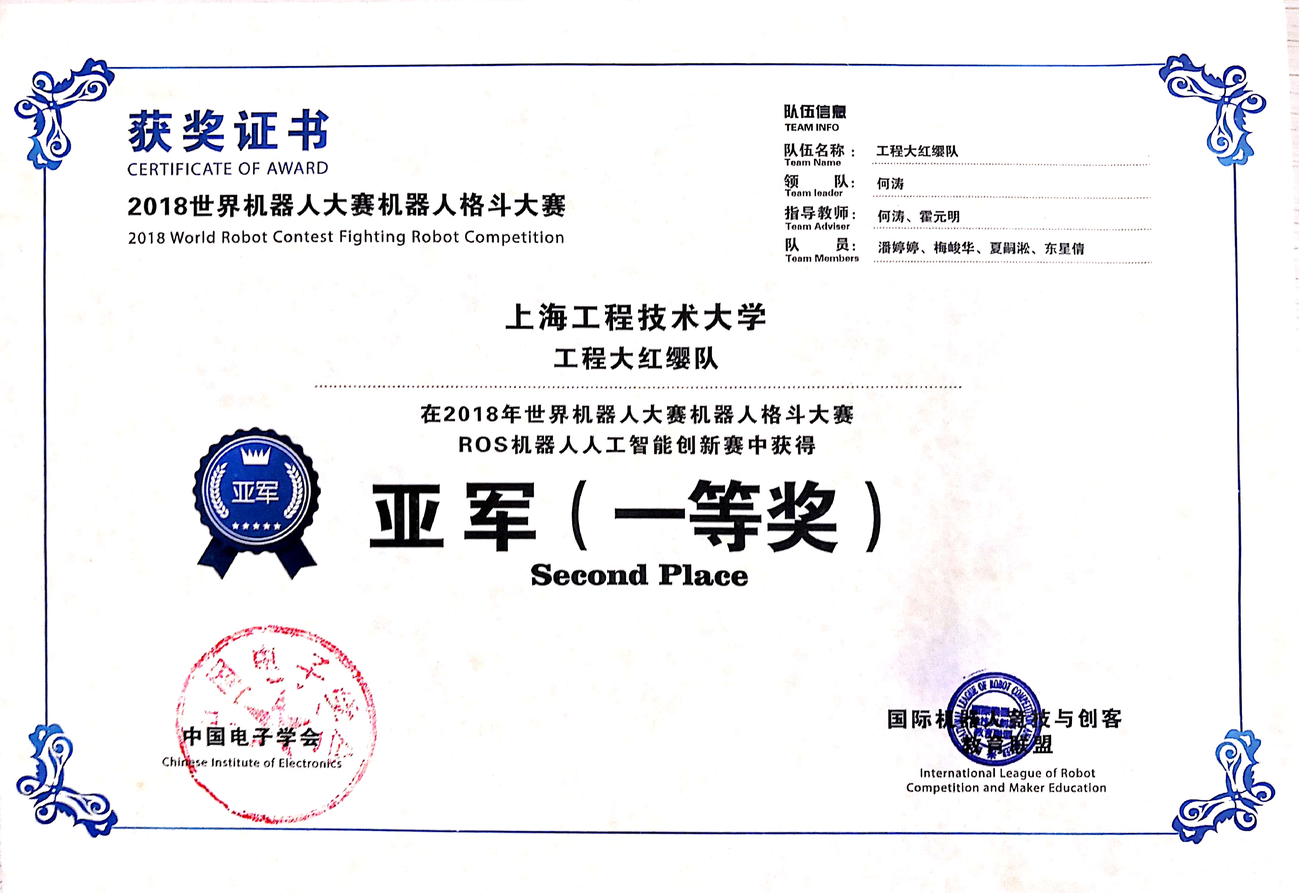 2018,10 | 上海市教育委员会 | 上海市大学生创意机器人挑战赛 | 特等奖、一等奖和二等奖各一项 |