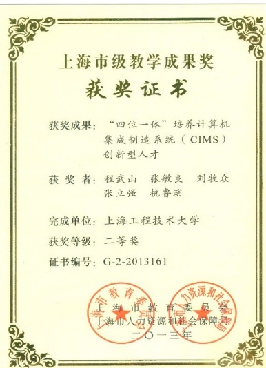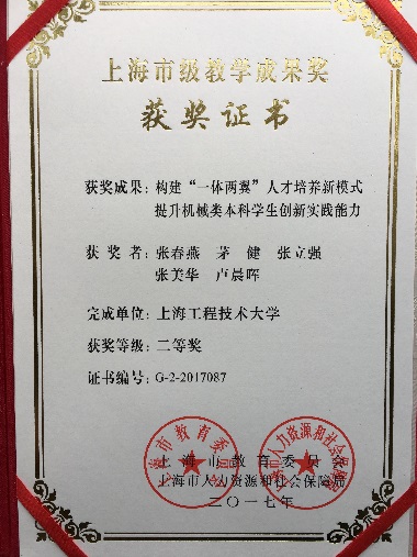 4 | 构建“一体两翼”人才培养新模式提升机械类本科学生创新实践能力 | 上海市教学成果奖二等奖 | 张立强 茅健 | 2017 |