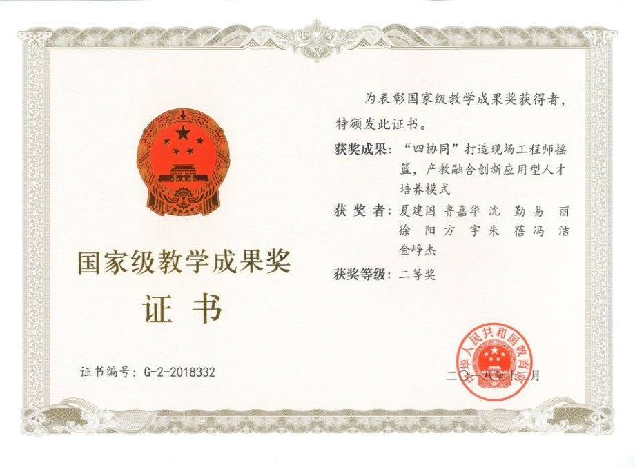 1 | "四协同"打造现场工程师摇篮,产教融合创新应用型人才培养模式 | 国家级教学成果奖二等奖 | 方宇 | 2018 |